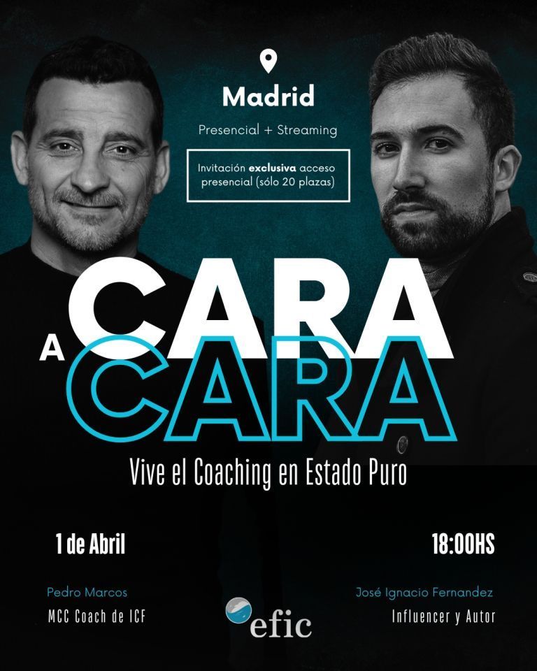 Únete al tercer evento de la serie «Cara a Cara» y sumérgete en el fascinante mundo de la comunicación no verbal y del coaching. En este encuentro exclusivo el Coach MCC Pedro Marcos se sentará junto a José Ignacio Fernández – reconocido experto en comunicación no verbal, criminólogo de profesión y creador de contenidos en redes, y orgulloso alumno del Curso Internacional Experto en Coaching de EFIC – hablarán sobre el mundo de la comunicación no verbal y del coaching y de su historia hasta llegar a ser un referente en RRSS como creador de contenidos en este ámbito.